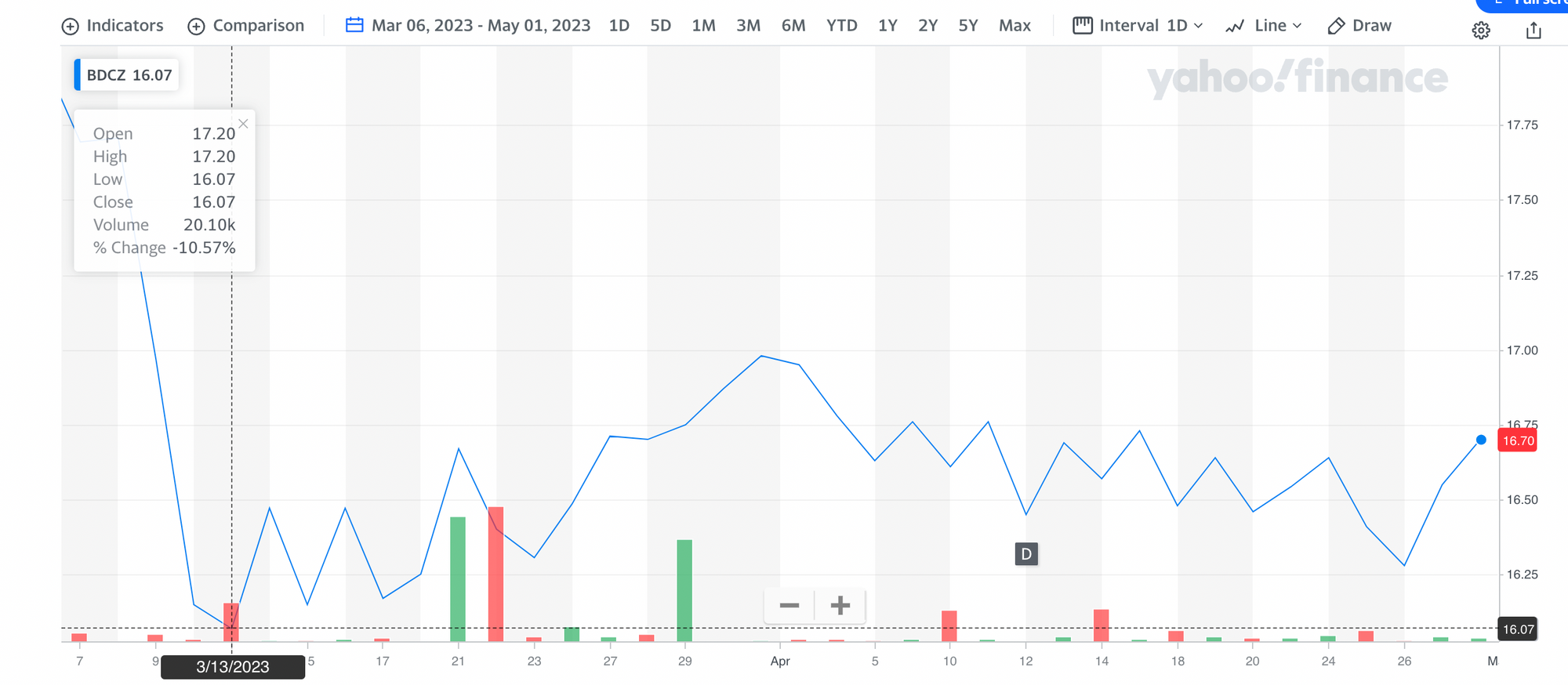 Using closing prices, BDCZ ended Friday 28, 2023 (7.1%) behind its level on March 6 when the SVB drama began to take hold. Admittedly, that's better than the (10.6%) drop that occurred right after - on March 13 - but hardly a return to the rally that had begun in mid-December 2022 and was going strong till we got the bad news out of San Francisco.